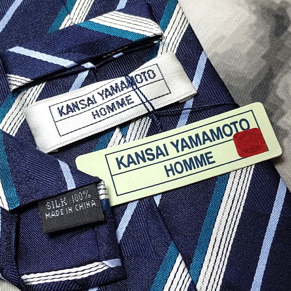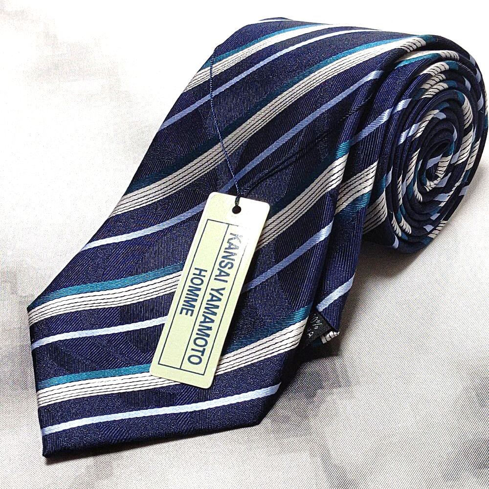カンサイヤマモト KANSAI YAMAMOTO 美品 新品未使用タグ付 微光沢 ネクタイ ストライプ 濃紺系 ネイビー系 M-009135