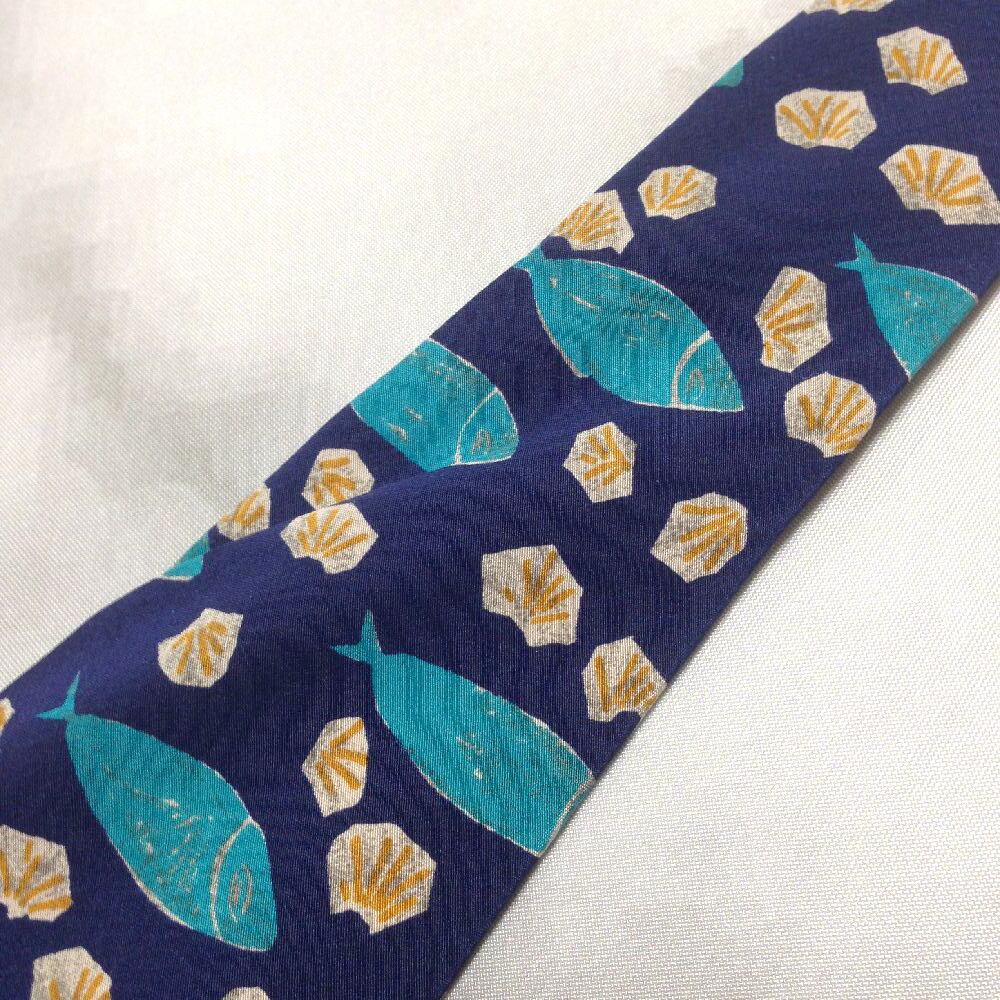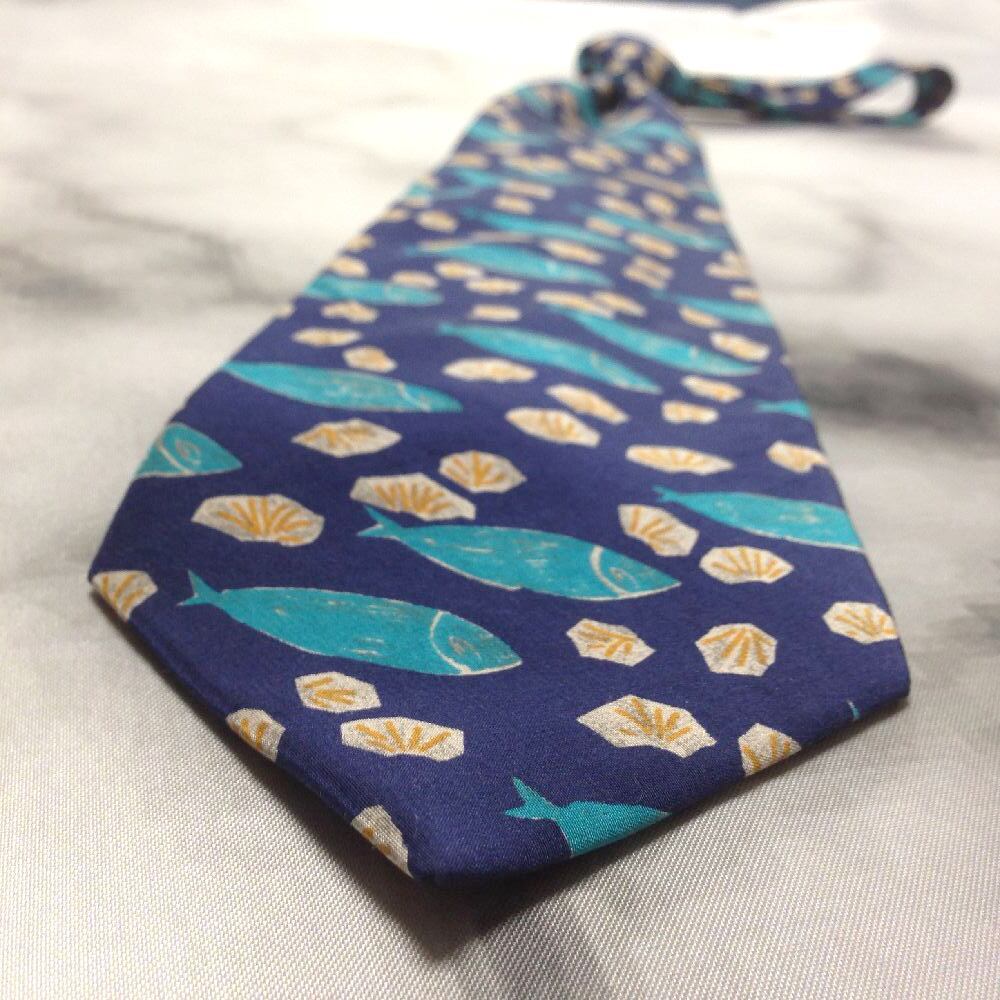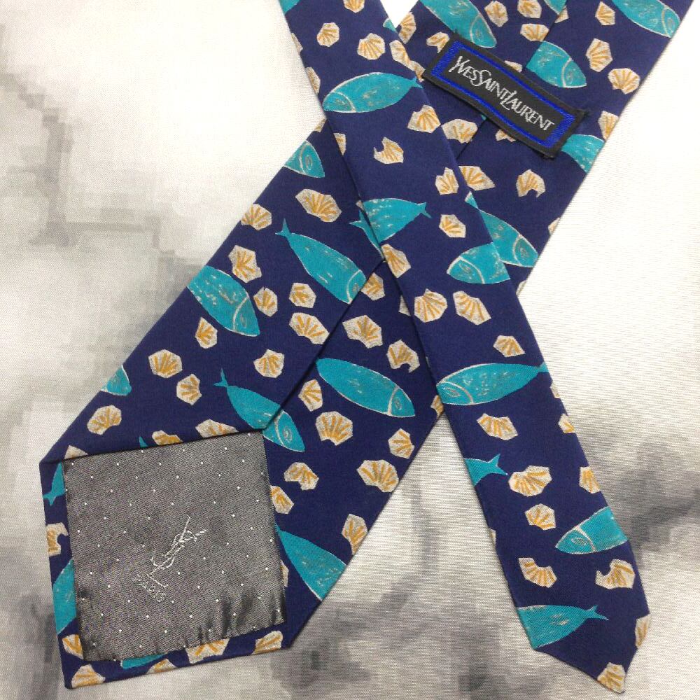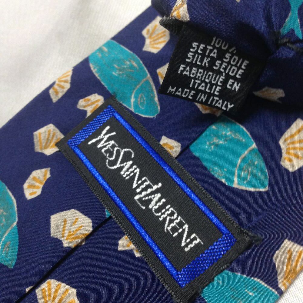 イヴ サンローラン Yves saint Laurent YSL 良品 微光沢 ネクタイ 魚柄 貝柄 マリン系 濃紺系 ネイビー系 Q-009225