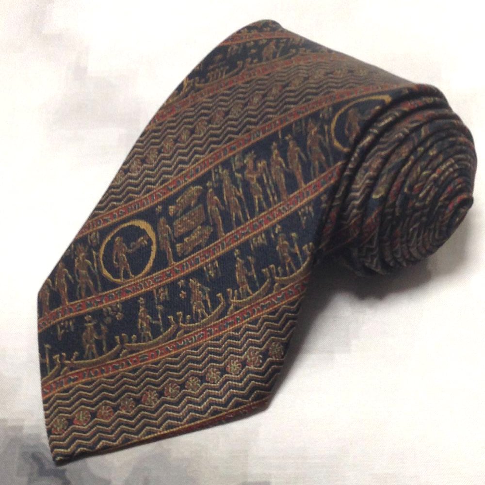 ビザン BYZAN 良品 クリーニング済 微光沢 ネクタイ シルク100% エジプト柄 濃紺系 ネイビー系 S-009276