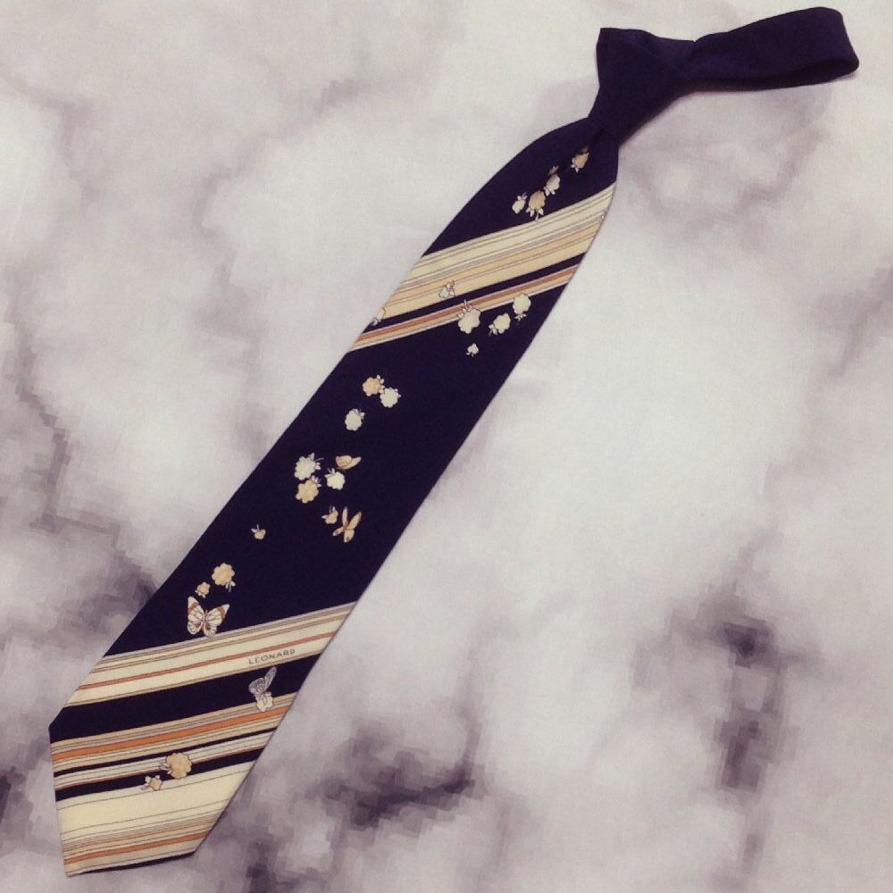 レオナール LEONARD 美品 未使用品 微光沢 ネクタイ イタリア製 蝶柄 バタフライ 濃紺系 ネイビー系 S-009277