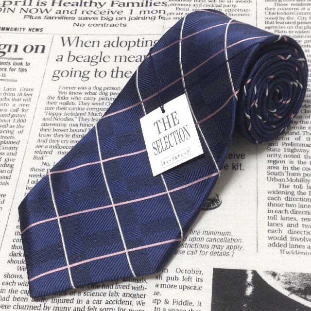 美品 新品未使用タグ付 微光沢 ネクタイ 日本製 シルク100% 格子柄 濃紺系 ネイビー系 P-007535