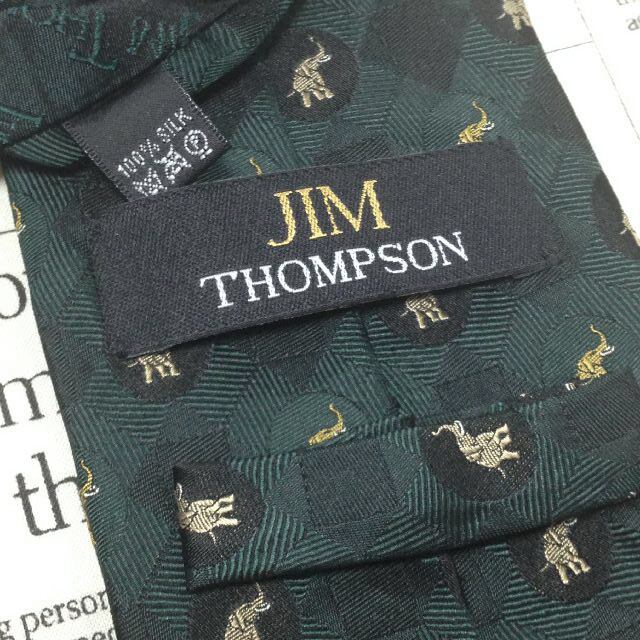 ジムトンプソン Jim Thompson 美品 微光沢 ネクタイ シルク100% 象柄 ゾウ 動物 アニマル 緑系 グリーン系 Q-007699