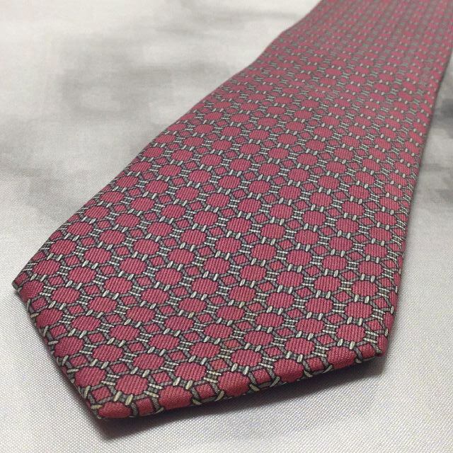 エルメス HERMES 微光沢 ネクタイ フランス製 シルク100% パターン柄 ワインレッド系 赤系 Q-007714