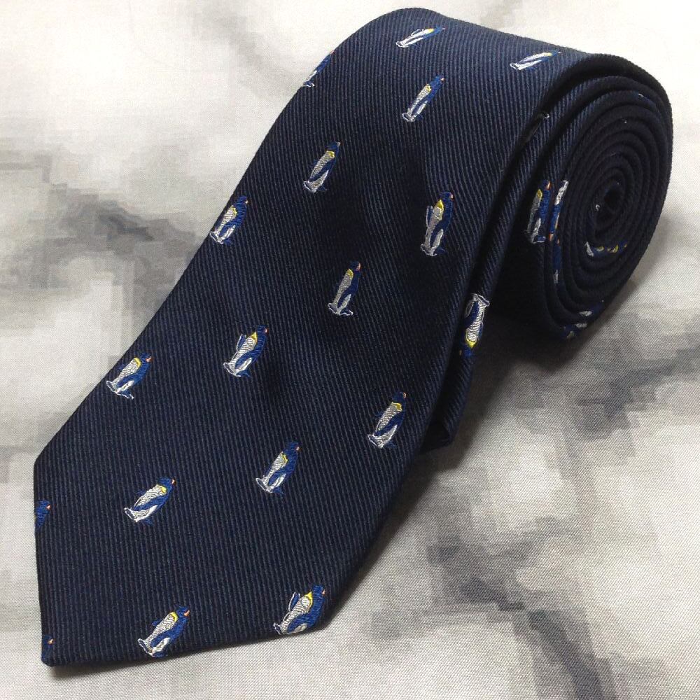 ポール スチュアート Paul Stuart 良品 微光沢 ネクタイ シルク100% ペンギン 動物 アニマル 濃紺系 ネイビー系 U-007936