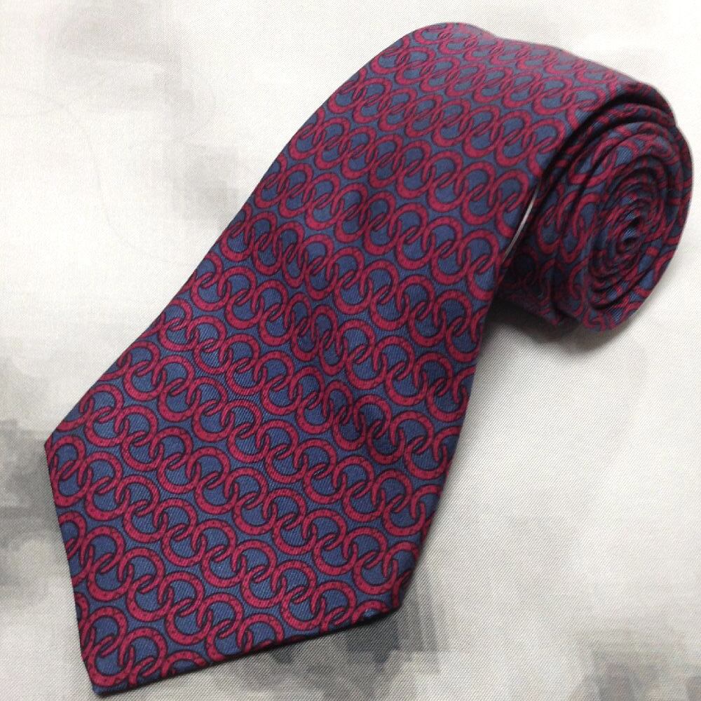 エルメス HERMES 微光沢 ネクタイ フランス製 シルク100% パターン柄 濃紺系 ネイビー系 ワインレッド系 V-007957