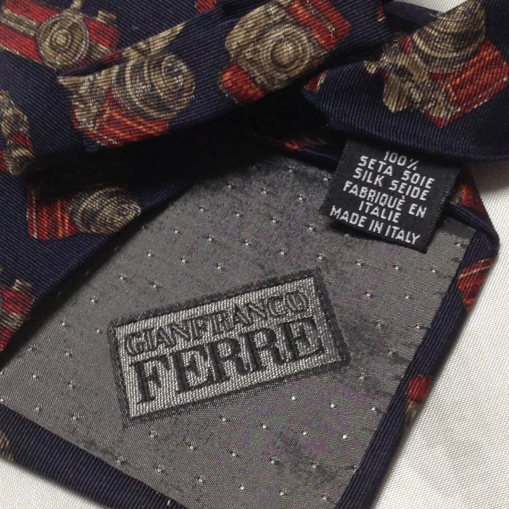ジャンフランコフェレ GIANFRANCO FERRE 良品 微光沢 ネクタイ シルク100% カメラ柄 濃紺系 ネイビー系 Y-008226