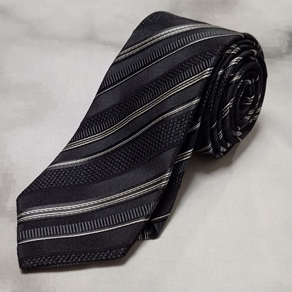 タケオキクチ TAKEO KIKUCHI TK 美品 未使用品 微光沢 ネクタイ 斜めストライプ 黒系 ブラック系 H-008759